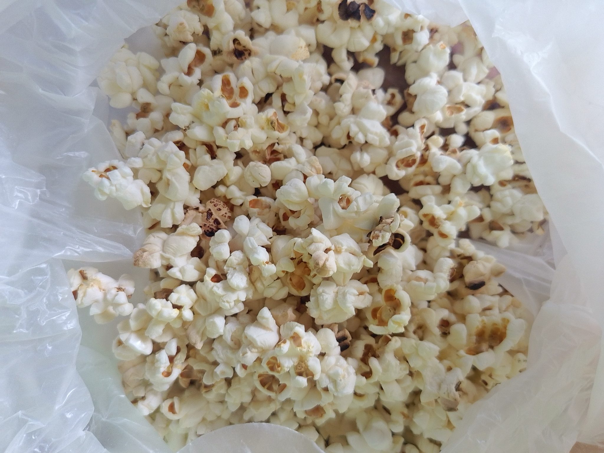 A close-up view of a pile of freshly popped popcorn displayed inside a white plastic bag.” af appealdahal/ CC0 1.0